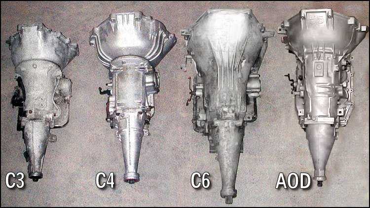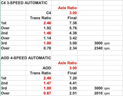 This chart shows the Transmission ratios for the C4 and the AOD, plus the ratios for the C4 with the gear-splitting tail-housing.